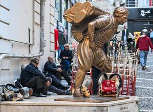 (251201) — ESTAMBUL, 1 diciembre, 2025 (Xinhua) — Imagen del 25 de noviembre de 2025 de porteadores descansando junto a una estatua de un porteador, en el distrito comercial de Eminonu de Estambul, Turquía. En el casco antiguo de Estambul, es frecuente encontrar una escena familiar: hombres serpenteando por calles estrechas, transportando pesadas cargas en sus espaldas o empujándolas en carretas. Conocidos en turco como “hamal”, estos porteadores tradicionales representan una profesión que se remonta a la época otomana y perdura hasta nuestros días. (Xinhua/(Liu Lei) (rtg) (ah) (ce)