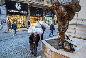 (251201) -- ESTAMBUL, 1 diciembre, 2025 (Xinhua) -- Imagen del 6 de noviembre de 2025 de porteadores transportando mercancía frente a una estatua de un porteador, en el distrito comercial de Eminonu de Estambul, Turquía. En el casco antiguo de Estambul, es frecuente encontrar una escena familiar: hombres serpenteando por calles estrechas, transportando pesadas cargas en sus espaldas o empujándolas en carretas. Conocidos en turco como "hamal", estos porteadores tradicionales representan una profesión que se remonta a la época otomana y perdura hasta nuestros días. (Xinhua/(Liu Lei) (rtg) (ah) (ce)