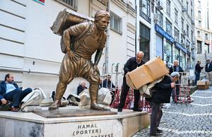 (251201) -- ESTAMBUL, 1 diciembre, 2025 (Xinhua) -- Imagen del 6 de noviembre de 2025 de un porteador cargando mercancía en sus hombros con la ayuda de un colega, en el distrito comercial de Eminonu de Estambul, Turquía. En el casco antiguo de Estambul, es frecuente encontrar una escena familiar: hombres serpenteando por calles estrechas, transportando pesadas cargas en sus espaldas o empujándolas en carretas. Conocidos en turco como "hamal", estos porteadores tradicionales representan una profesión que se remonta a la época otomana y perdura hasta nuestros días. (Xinhua/(Liu Lei) (rtg) (ah) (ce)