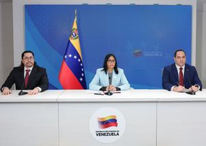 (251202) -- CARACAS, 2 diciembre, 2025 (Xinhua) -- Imagen proveída por la Vicepresidencia de Venezuela de la vicepresidenta venezolana, Delcy Rodríguez (c), participando durante una conferencia de prensa, en Caracas, Venezuela, el 2 de diciembre de 2025. Un "tribunal estadounidense decidió definitivamente robar CITGO", la empresa petrolera venezolana asentada en Estados Unidos y filial de la estatal Petróleos de Venezuela, denunció el martes Rodríguez. (Xinhua/Vicepresidencia de Venezuela) (ms) (jg) (ra) (vf)