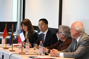 (251202) -- SANTIAGO, 2 diciembre, 2025 (Xinhua) -- El embajador de China en Chile, Niu Qingbao (2-i), pronuncia un discurso durante la presentación del libro "En China" del fotógrafo chileno, Miguel Sayago, en el Complejo Universitario VM20 de la Universidad de Chile, en Santiago, capital de Chile, el 2 de diciembre de 2025. Con el fin de acercar la cultura y la cotidianidad de los chinos, se presentó el martes en Chile el libro de fotografías "En China", del loado fotógrafo chileno, Miguel Sayago, quien en varias visitas al país asiático dejó registro de la herencia milenaria, pero también de los avances tecnológicos. (Xinhua/Jorge Villegas) (jv) (oa) (ah) (ce)
