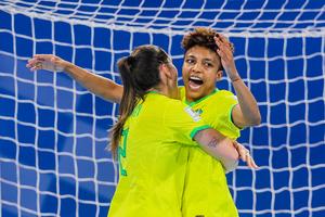 (251203) -- CIUDAD DE PASIG, 3 diciembre, 2025 (Xinhua) -- Imagen del 2 de diciembre de 2025 de Luana Rodrigues (d), de Brasil, festejando después de anotar durante el partido de cuartos de final entre Brasil y Japón, en la Copa Mundial Femenina de Futsal de la FIFA 2025, en la Ciudad de Pasig, Filipinas. (Xinhua/Rouelle Umali) (ah) (ra) (ce)