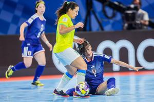 (251203) -- CIUDAD DE PASIG, 3 diciembre, 2025 (Xinhua) -- Imagen del 2 de diciembre de 2025 de Diana (i-frente), de Brasil, disputando el balón con Oino Sara (d), de Japón, durante el partido de cuartos de final entre Brasil y Japón, en la Copa Mundial Femenina de Futsal de la FIFA 2025, en la Ciudad de Pasig, Filipinas. (Xinhua/Rouelle Umali) (ah) (ra)(ce)