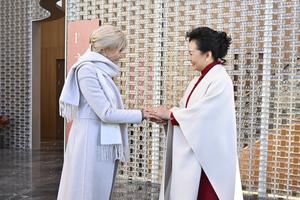 (251204) -- BEIJING, 4 diciembre, 2025 (Xinhua) -- Peng Liyuan, esposa del presidente chino, Xi Jinping, y Brigitte Macron, esposa del presidente francés, Emmanuel Macron, visitan el Teatro de Arte Popular de Beijing, en Beijing, capital of China, el 4 de diciembre de 2025. Brigitte acompaña al presidente francés en su visita de Estado a China. (Xinhua/Li Xiang) (da) (ra) (ce)
