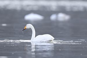 (251204) -- HUALONG, 4 diciembre, 2025 (Xinhua) -- Imagen del 2 de diciembre de 2025 de un cisne visto en la orilla del río Amarillo, en el distrito autónomo hui de Hualong de la ciudad de Haidong, en la provincia de Qinghai, en el noroeste de China. Casi 100 cisnes migratorios volaron al humedal para pasar el invierno. (Xinhua/Qi Zhiyue) (da) (ra) (ce)