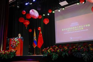 (251204) -- QUITO, 4 diciembre, 2025 (Xinhua) -- Imagen del 2 de diciembre de 2025 del embajador de China en Ecuador, Sun Xiangyang, hablando durante una ceremonia por el 15º aniversario del Instituto Confucio de la Universidad San Francisco de Quito (USFQ), en la ciudad de Quito, capital de Ecuador. El Instituto Confucio de la USFQ celebró el martes su 15º aniversario con una colorida ceremonia marcada por presentaciones musicales y las tradicionales danzas del dragón y del león, símbolos de prosperidad y buena fortuna en la cultura china. (Xinhua/Ricardo Landeta) (rl) (da) (ra) (vf)