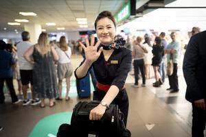 (251205) -- EZEIZA, 5 diciembre, 2025 (Xinhua) -- Imagen del 4 de diciembre de 2025 de una sobrecargo de China Eastern Airlines saludando durante la llegada del primer vuelo directo entre China y Argentina operado por China Eastern Airlines, en el Aeropuerto Internacional de Ezeiza, en Buenos Aires, Argentina. El primer vuelo directo entre China y Argentina aterrizó el jueves en el Aeropuerto Internacional de Ezeiza, en Buenos Aires, lo que significa un nuevo puente entre ambos países y la apertura de nuevas oportunidades para los sectores turístico, comercial y empresarial. (Xinhua/Martín Zabala) (mz) (rtg) (ra) (ce)