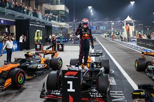 (251207) -- ABU DABI, 7 diciembre, 2025 (Xinhua) -- Imagen del 6 de diciembre de 2025 del piloto neerlandés de la escudería Red Bull, Max Verstappen, festejando al obtener la pole position, al término de la clasificación del Gran Premio de Abu Dabi de F1 en el circuito Yas Marina, en Abu Dabi, Emiratos Arabes Unidos. (Xinhua/Qian Jun) (rtg) (ah)