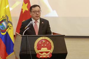 (251206) -- QUITO, 6 diciembre, 2025 (Xinhua) -- Imagen del 4 de diciembre de 2025 del embajador chino en Ecuador, Sun Xiangyang, hablando durante la ceremonia de entrega de la "Beca Embajador chino 2025" llevada a cabo en la Embajada de China, en la ciudad de Quito, capital de Ecuador. Un grupo de 42 estudiantes ecuatorianos destacados en el aprendizaje del idioma chino recibió la noche del jueves la "Beca Embajador chino 2025" durante una ceremonia especial en la que se destacó la creciente profundización de los intercambios y la cooperación cultural y educativa entre ambos países. (Xinhua/Ricardo Landeta) (rl) (jg) (da)