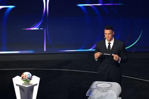 (251206) -- WASHINGTON D. C., 6 diciembre, 2025 (Xinhua) -- Imagen del 5 de diciembre de 2025 del asistente de sorteo, Aaron Judge, sosteniendo el boleto de Uzbekistán durante el Sorteo Final de la Copa Mundial de la FIFA 2026 en el Kennedy Center, en Washington D. C., Estados Unidos. (Xinhua/Wu Xiaoling) (oa) (da)