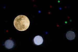 (251205) -- SAN SALVADOR, 5 diciembre, 2025 (Xinhua) -- Imagen del 4 de diciembre de 2025 de la luna llena vista entre luces navideñas, en el departamento de San Salvador, El Salvador. (Xinhua/Alexander Peña) (ap) (oa) (ra) (ce)