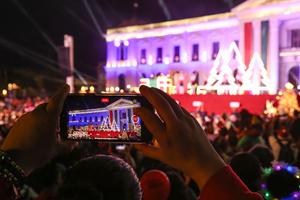 (251206) -- SAN SALVADOR, 6 diciembre, 2025 (Xinhua) -- Imagen del 5 de diciembre de 2025 de una persona grabando un vídeo de una presentación de danza durante la inauguración de la Villa Navideña en el Centro Histórico, en el departamento de San Salvador, El Salvador. (Xinhua/Alexander Peña) (ap) (oa) (da)