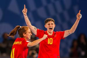(251207) -- CIUDAD DE PASIG, 7 diciembre, 2025 (Xinhua) -- Jugadoras de España festejan después de una anotación durante el partido por el tercer lugar entre España y Argentina en la Copa Mundial Femenina de Futsal de la FIFA 2025, en la Ciudad de Pasig, Filipinas, el 7 de diciembre de 2025. (Xinhua/Rouelle Umali) (rtg) (da)