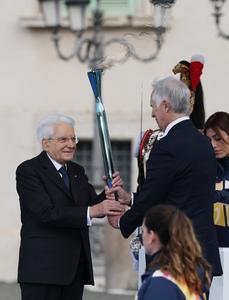 (251205) -- ROMA, 5 diciembre, 2025 (Xinhua) -- Giovanni Malago (d), presidente del comité organizador de Milán-Cortina, entrega la antorcha al presidente italiano, Sergio Mattarella, durante la ceremonia de encendido del pebetero de los Juegos Olímpicos de Invierno Milán-Cortina 2026 en el Palacio del Quirinal, en Roma, Italia, el 5 de diciembre de 2025. (Xinhua/Li Jing) (oa) (vf)