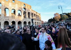 (251207) -- ROMA, 7 diciembre, 2025 (Xinhua) -- Imagen del 6 de diciembre de 2025 del portador de la antorcha, el cantante italiano, Achille Lauro, transportando la antorcha olímpica durante el relevo de la antorcha para los Juegos Olímpicos de Invierno Milán-Cortina 2026 en el Coliseo, en Roma, Italia. (Xinhua/Li Jing) (rtg) (ah)