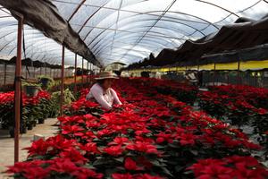 (251206) -- CIUDAD DE MEXICO, 6 diciembre, 2025 (Xinhua) -- Imagen del 5 de diciembre de 2025 de una mujer acomodando flores de Nochebuena, en la Ciudad de México, capital de México. (Xinhua/Francisco Cañedo) (oa) da)