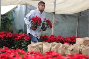 (251206) -- CIUDAD DE MEXICO, 6 diciembre, 2025 (Xinhua) -- Imagen del 5 de diciembre de 2025 de un hombre transportando flores de Nochebuena, en la Ciudad de México, capital de México. (Xinhua/Francisco Cañedo) (oa) (da)
