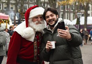 (251207) — LA HAYA, 7 diciembre, 2025 (Xinhua) — Imagen del 6 de diciembre de 2025 de un hombre tomándose fotografías con un actor vestido de Santa Claus en la Feria Real de Navidad, en La Haya, Países Bajos. Iniciada el 4 de diciembre, la feria se prolongará hasta el 23 de diciembre. (Xinhua/Shao Haijun) (oa) (da)