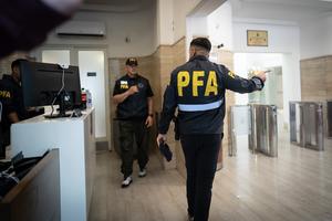 (251209) -- BUENOS AIRES, 9 diciembre, 2025 (Xinhua) -- Miembros de la Policía Federal Argentina realizan un allanamiento en la sede de la Asociación del Fútbol Argentino (AFA), en la ciudad de Buenos Aires, capital de Argentina, el 9 de diciembre de 2025. (Xinhua/Martín Zabala) (mz) (oa) (ah) (vf)
