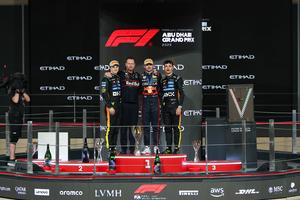 (251208) -- ABU DABI, 8 diciembre, 2025 (Xinhua) -- Imagen del 7 de diciembre de 2025 del piloto neerlandés de la escudería Red Bull, Max Verstappen (2-d), el piloto británico de la escudería McLaren, Lando Norris (d), y el piloto australiano de la escudería McLaren, Oscar Piastri (i), posando para fotografías al término del Gran Premio de Abu Dabi de Fórmula Uno, en el circuito Yas Marina, en Abu Dabi, Emiratos Arabes Unidos. (Xinhua/Zhu Xingjian) (rtg) (ah) (vf)