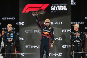 (251208) -- ABU DABI, 8 diciembre, 2025 (Xinhua) -- Imagen del 7 de diciembre de 2025 del piloto neerlandés de la escudería Red Bull, Max Verstappen (c), sosteniendo el trofeo al término del Gran Premio de Abu Dabi de Fórmula Uno, en el circuito Yas Marina, en Abu Dabi, Emiratos Arabes Unidos. (Xinhua/Zhu Xingjian) (rtg) (ah) (vf)