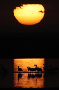 (251206) -- FAYUM, 6 diciembre, 2025 (Xinhua) -- Imagen del 6 de diciembre de 2025 de flamencos al amanecer en el Lago Qarun, en la provincia de Fayún, Egipto. Gran cantidad de flamencos vuelan al lago para pasar el invierno. (Xinhua/Ahmed Gomaa) (oa) da)