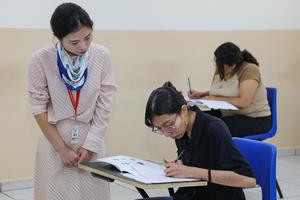(251206) -- SAN SALVADOR, 6 diciembre, 2025 (Xinhua) -- La profesora china Wu Fengming (i) supervisa a alumnos que realizan las primeras pruebas de certificación del idioma chino mandarín en el Instituto Confucio de la Universidad de El Salvador (UES), en el departamento de San Salvador, El Salvador, el 6 de diciembre de 2025. El Instituto Confucio de la UES develó el sábado la placa que lo acredita como el primer centro autorizado para aplicar las pruebas de certificación del idioma chino mandarín HSK en la región CA-4 (El Salvador, Guatemala, Honduras y Nicaragua), un paso considerado "histórico" para la formación lingüística en el país. (Xinhua/Alexander Peña) (ap) (jg) (da)
