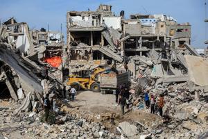 (251209) -- GAZA, 9 diciembre, 2025 (Xinhua) -- Imagen del 8 de diciembre de 2025 de una excavadora retirando los escombros de las viviendas destruidas en anteriores ataques aéreos israelíes, en la ciudad de Khan Younis, en el sur de la Franja de Gaza. (Xinhua/Rizek Abdeljawad) (oa) (ah) (vf)