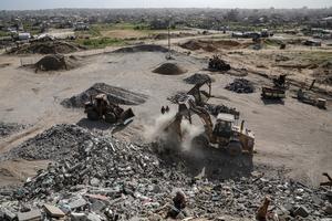 (251209) -- GAZA, 9 diciembre, 2025 (Xinhua) -- Imagen del 8 de diciembre de 2025 de una excavadora transportando los escombros de las viviendas destruidas en anteriores ataques aéreos israelíes a un gran vertedero, en la ciudad de Khan Younis, en el sur de la Franja de Gaza. (Xinhua/Rizek Abdeljawad) (oa) (ah) (vf)