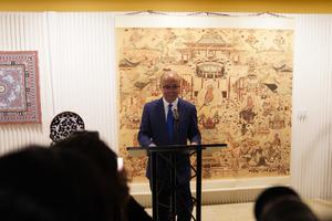 (251209) -- NACIONES UNIDAS, 9 diciembre, 2025 (Xinhua) -- Imagen del 8 de diciembre de 2025 de Yu Yougen, consejero educativo del Consulado General de China en Nueva York, hablando en una exposición que muestra el trabajo de investigación y diseño de la Universidad de Tsinghua inspirado en el arte antiguo de Dunhuang, en la sede de la ONU, en Nueva York. Más de 80 obras son exhibidas en la exposición, desde maestros antiguos como Pang Xunqin, Chang Sha'na, Chen Hanmin y Liu Jude, hasta nuevas piezas de estudiantes y exalumnos de Tsinghua. (Xinhua/Zhang Fengguo) (jg) (ra) (vf)