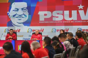 (251208) -- MIRANDA, 8 diciembre, 2025 (Xinhua) -- El secretario general del Partido Socialista Unido de Venezuela (PSUV), Diosdado Cabello (c-atrás), habla durante una conferencia de prensa, en el estado de Miranda, Venezuela, el 8 de diciembre de 2025. Cabello agradeció el lunes el respaldo internacional al país sudamericano ante la amenaza militar de Estados Unidos. (Xinhua/Marcos Salgado) (ms) (rtg) (ah) (vf)