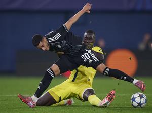 (251211) -- VILLARREAL, 11 diciembre, 2025 (Xinhua) -- Imagen del 10 de diciembre de 2025 de Elias Achouri (frente), de Copenhagen, disputando el balón con Pape Gueye, de Villarreal, durante el partido de fútbol de la Liga de Campeones de la UEFA, entre Villarreal y Copenhagen, en Villarreal, España. (Xinhua/Str) (rtg) (ra) (vf)