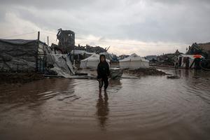 (251211) -- GAZA, 11 diciembre, 2025 (Xinhua) -- Un niño palestino desplazado permanece afuera durante la lluvia, en el barrio de Zeitoun, en el sureste de la ciudad de Gaza, el 11 de diciembre de 2025. Las fuertes lluvias invernales y los fuertes vientos están azotando los precarios refugios temporales de tiendas de campaña y lonas en la Franja de Gaza, poniendo en riesgo a más personas vulnerables, según informaron el miércoles organizaciones humanitarias de la ONU. (Xinhua/Rizek Abdeljawad) (da) (ra) (vf)