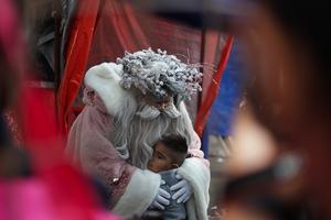 (251210) -- CIUDAD DE MEXICO, 10 diciembre, 2025 (Xinhua) -- Imagen del 8 de diciembre de 2025 del "Santa Iluminado", personaje caracterizado por el artista José Miguel Moctezuma, abrazando a un niño durante su recorrido por una calle del barrio de Tepito, en la Ciudad de México, capital de México. (Xinhua/Francisco Cañedo) (fc) (jg) (da) (vf)