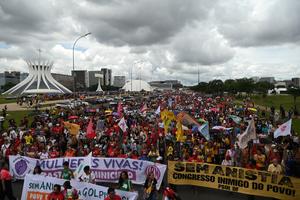 (251214) -- BRASILIA, 14 diciembre, 2025 (Xinhua) -- Manifestantes participan en una protesta en contra de la amnistía para los involucrados en los hechos del 8 de enero de 2023, y el proyecto de ley que reduce el tiempo de prisión de los condenados por el intento de golpe de Estado, en Brasilia, Brasil, el 14 de diciembre de 2025. (Xinhua/Lucio Tavora) (lt) (rtg) (ah)