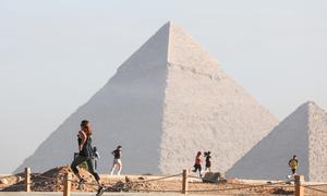 (251213) -- GIZA, 13 diciembre, 2025 (Xinhua) -- Corredores participan en el Medio Maratón de las Pirámides celebrado en el punto escénico de las Pirámides de Giza, en Giza, Egipto, el 13 de diciembre de 2025. Alrededor de 10.000 corredores compitieron el sábado durante el medio maratón en la famosa área de las pirámides. (Xinhua/Ahmed Gomaa) (oa) (da)