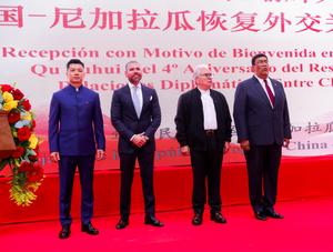 (251213) -- MANAGUA, 13 diciembre, 2025 (Xinhua) -- Imagen cedida por el Consejo de Comunicación y Ciudadanía de la República de Nicaragua del 10 de diciembre de 2025 del Asesor Presidencial para la Promoción de Inversiones, Comercio y Cooperación Internacional de la República de Nicaragua, Laureano Ortega Murillo (2-i), el presidente de la junta directiva de la Asamblea Nacional de Nicaragua, Gustavo Porras (2-d), el cocanciller de Nicaragua, Valdrack Jaentschke (d), y el embajador de China en Nicaragua, Qu Yuhui (i), participando durante una recepción en ocasión del cuarto aniversario del restablecimiento de las relaciones diplomáticas entre China y Nicaragua, en Managua, Nicaragua. Se celebró en Managua la noche del miércoles una recepción en ocasión del cuarto aniversario del restablecimiento de las relaciones diplomáticas entre China y Nicaragua, asimismo se dio la bienvenida al embajador Qu Yuhui. (Xinhua/Consejo de Comunicación y Ciudadanía de la República de Nicaragua) (fc) (oa) (rtg) (jg) (ra) (da)