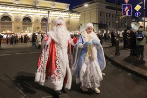 (251214) -- SAN PETERSBURGO, 14 diciembre, 2025 (Xinhua) -- Imagen del 13 de diciembre de 2025 de personas disfrazadas de Papá Noel y la Doncella de las Nieves paseando por un mercado navideño, en San Petersburgo, Rusia. Un mercado navideño se inauguró el sábado aquí con motivo de las próximas fiestas de Navidad y Año Nuevo. (Xinhua/Irina Motina) (oa) (ah)