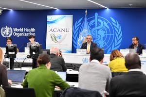 (251212) -- GINEBRA, 12 diciembre, 2025 (Xinhua) -- Imagen del 11 de diciembre de 2025 del director general de la Organización Mundial de la Salud (OMS), Tedros Adhanom Ghebreyesus (2-d), hablando durante una conferencia de prensa, en Ginebra, Suiza. El año 2025 ha traído tanto avances significativos como grandes desafíos para la OMS y la salud mundial en general, dijo Tedros el jueves. (Xinhua/Lian Yi) (rtg) (ra) (vf)