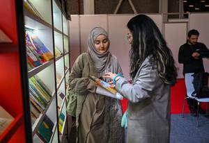 (251214) -- ESTAMBUL, 14 diciembre, 2025 (Xinhua) -- Imagen del 13 de diciembre de 2025 de una editora china (d), presentando libros chinos a una lectora turca en la 42ª Feria Internacional del Libro de Estambul, en Estambul, Turquía. La feria del libro se inauguró el sábado en Estambul, la ciudad más grande de Turquía. La delegación editorial china presentó más de 700 libros de alta calidad en la feria, lo que atrajo a muchos lectores locales. (Xinhua/Liu Lei) (oa) (da)