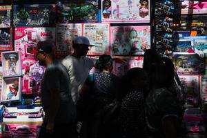 (251213) -- CARACAS, 13 diciembre, 2025 (Xinhua) -- Personas observan juguetes en un puesto callejero de ventas por la temporada navideña, en Caracas, Venezuela, el 13 de diciembre de 2025. (Xinhua/Marcos Salgado) (ms) (oa) (da)