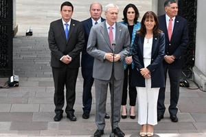 (251215) -- SANTIAGO, 15 diciembre, 2025 (Xinhua) -- El mandatario electo, José Antonio Kast (i-frente), habla con la prensa después de una reunión con el presidente chileno, Gabriel Boric, en el Palacio de La Moneda, en Santiago, capital de Chile, el 15 de diciembre de 2025. Boric recibió el lunes al mandatario electo José Antonio Kast y destacó que "la capacidad de trabajar por el bienestar de Chile es lo que engrandece y hace avanzar a nuestro país". (Xinhua/Jorge Villegas) (jv) (oa) (ah) (vf)
