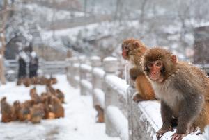 (251216) -- BEIJING, 16 diciembre, 2025 (Xinhua) -- Imagen del 13 de diciembre de 2025 de monos descansando sobre una barandilla en el punto escénico de la montaña Huaguo tras una nevada, en la ciudad de Lianyungang, en la provincia de Jiangsu, en el este de China. (Xinhua/Wang Jianmin) (jg) (ra) (vf)