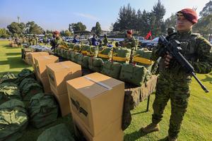 (251216) -- QUITO, 16 diciembre, 2025 (Xinhua) -- Miembros del Ejército ecuatoriano montan guardia junto a equipo militar durante la ceremonia de entrega de nuevo equipamiento a las Fuerzas Armadas llevada a cabo en el Fuerte Militar Eplicachima, en Quito, capital de Ecuador, el 16 de diciembre de 2025. El presidente de Ecuador, Daniel Noboa, entregó el martes nuevo equipamiento a las Fuerzas Armadas para fortalecer su capacidad logística y operativa en la lucha contra el "narcoterrorismo", que afecta al país sudamericano. (Xinhua/Ricardo Landeta) (rl) (jg) (ra) (vf)