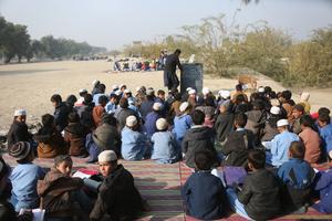 (251217) -- NANGARHAR, 17 diciembre, 2025 (Xinhua) -- Imagen del 16 de diciembre de 2025 de estudiantes tomando una clase al aire libre en una escuela improvisada sin refugios adecuados junto a un cruce de carreteras, en la provincia de Nangarhar, en el este de Afganistán. (Xinhua/Saifurahman Safi) (ah) (ra) (vf)