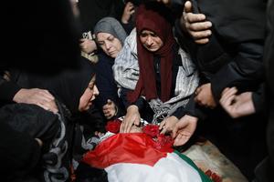 (251217) -- BELEN, 17 diciembre, 2025 (Xinhua) -- Imagen del 16 de diciembre de 2025 de dolientes y familiares reuniéndose alrededor del cuerpo del joven palestino, Ammar Ta'amra, quien fue asesinado a tiros por el Ejército israelí, durante su funeral, en el poblado de Tuqu', en el sureste de Belén, Cisjordania. El palestino de 16 años de edad, Ammar Ta'amra, fue asesinado a tiros por el Ejército israelí durante una incursión militar en Tuqu' el lunes, dijo el Ministerio de Salud palestino. (Xinhua/Mamoun Wazwaz) (ah) (ra) (vf)