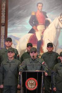 (251217) -- CARACAS, 17 diciembre, 2025 (Xinhua) -- Imagen proveída por el Ministerio para la Defensa de Venezuela del ministro venezolano de Defensa, Vladimir Padrino López (c-frente), hablando durante una conferencia de prensa, en Caracas, Venezuela, el 17 de diciembre de 2025. Padrino López afirmó el miércoles que Estados Unidos evidencia una desesperación en el manejo de su política exterior hacia Venezuela, tras recientes declaraciones del presidente estadounidense, Donald Trump, quien ordenó un bloqueo naval contra el país sudamericano. (Xinhua/Ministerio para la Defensa de Venezuela) (ms) (ah) (ra) (vf)