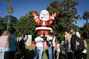 (251221) -- BUENOS AIRES, 21 diciembre, 2025 (Xinhua) -- Imagen del 20 de diciembre de 2025 de personas tomando fotografías a un muñeco inflable de Papá Noel durante el Paseo Navideño en la Plaza Sicilia, en la ciudad de Buenos Aires, capital de Argentina. La capital de Argentina, Buenos Aires, vive este fin de semana la magia de la Navidad, con una amplia variedad de propuestas, entre ellas paseos, jardines lumínicos, desfiles, espectáculos musicales y mercados alusivos. (Xinhua/Martín Zabala) (mz) (ah) (da)