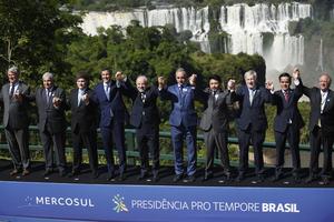 (251220) -- FOZ DO IGUACU, 20 diciembre, 2025 (Xinhua) -- (De izq. a der.) El director general para Asuntos Económicos de la Cancillería peruana, Jorge Félix Rubio Correa, el presidente panameño, José Raúl Mulino, el presidente argentino, Javier Milei, el presidente paraguayo, Santiago Peña, el presidente brasileño, Luiz Inácio Lula da Silva, el presidente uruguayo, Yamandú Orsi, el ministro de Relaciones Exteriores boliviano, Fernando Aramayo, el ministro de Relaciones Exteriores chileno, Alberto van Klaveren, el encargado de negocios de la Embajada de Ecuador en Brasil, Franklin Fernando Guzmán Gómez, y el secretario general de la Asociación Latinoamericana de Integración, Sergio Abreu Bonilla, reaccionan mientras posan para una fotografía familiar durante la 67ª Cumbre de Jefes de Estado del Mercado Común del Sur (Mercosur), en Foz do Iguacu, Brasil, el 20 de diciembre de 2025. Lula da Silva abrió el sábado en la ciudad de Foz do Iguacu, estado de Paraná, la 67ª Cumbre de Jefes de Estado del Mercosur, afirmando que el bloque es un ejemplo de multilateralismo y que "el mundo está ávido por cerrar acuerdos" con él. (Xinhua/Lucio Tavora) (lt) (jg) (da)