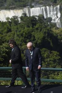 (251220) -- FOZ DO IGUACU, 20 diciembre, 2025 (Xinhua) -- El presidente brasileño, Luiz Inácio Lula da Silva (d), y el presidente argentino, Javier Milei (i), llegan para participar en la toma de una fotografía familiar durante la 67ª Cumbre de Jefes de Estado del Mercado Común del Sur (Mercosur), en Foz do Iguacu, Brasil, el 20 de diciembre de 2025. Lula da Silva abrió el sábado en la ciudad de Foz do Iguacu, estado de Paraná, la 67ª Cumbre de Jefes de Estado del Mercosur, afirmando que el bloque es un ejemplo de multilateralismo y que "el mundo está ávido por cerrar acuerdos" con él. (Xinhua/Lucio Tavora) (lt) (jg) (da)